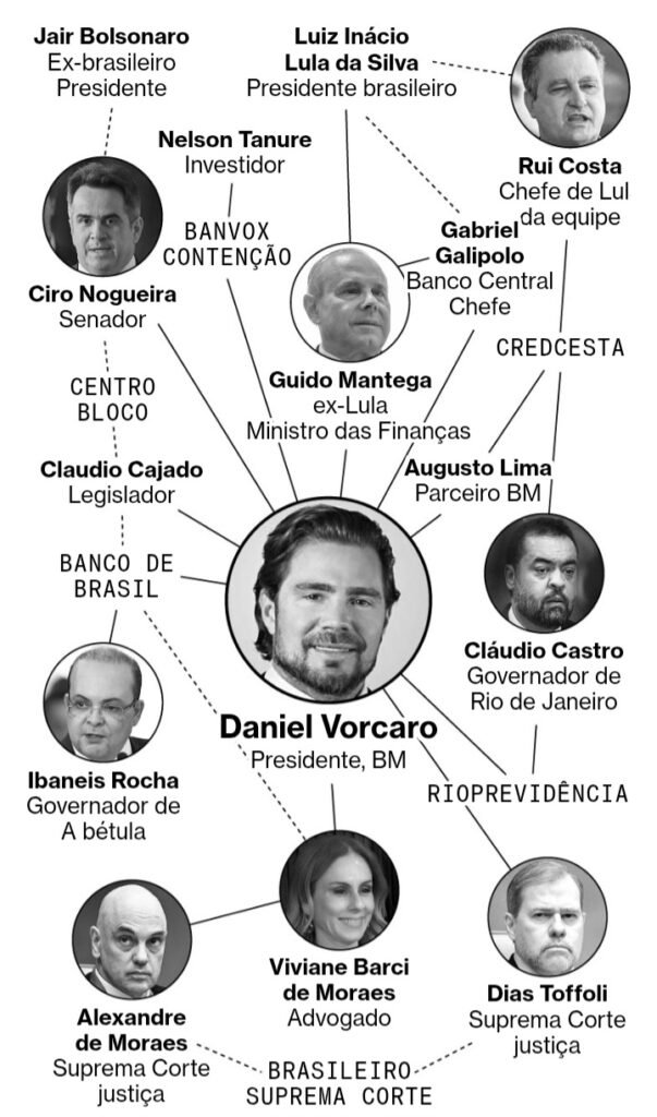 Em matéria recente sobre o caso Banco Master, a Bloomberg montou um gráfico de rede informativo, visualizando as conexões envolvendo Daniel Vorcaro, ex-CEO do banco, apontando os laços do Banco Master com os principais figuras de poder do Brasil.