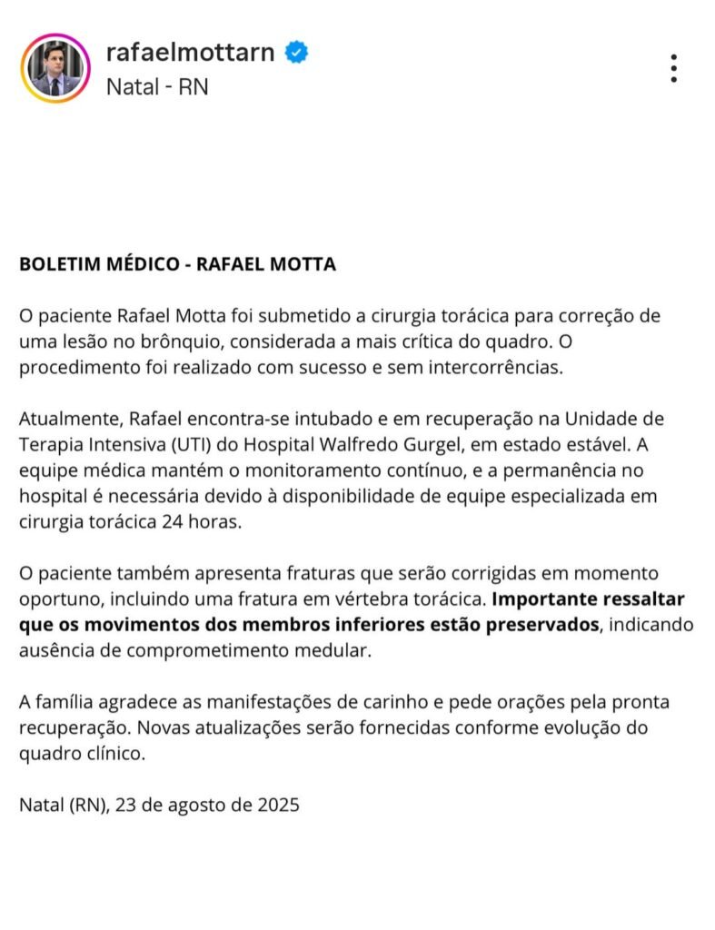 O ex-deputado federal Rafael Motta segue internado na Unidade de Terapia Intensiva (UTI) do Hospital Walfredo Gurgel, em Natal, após sofrer um acidente durante a prática de kitesurfe. Segundo novo boletim divulgado na tarde deste sábado (23), ele foi submetido com sucesso a uma cirurgia torácica para correção de uma lesão no brônquio, considerada a mais grave de seu quadro clínico.