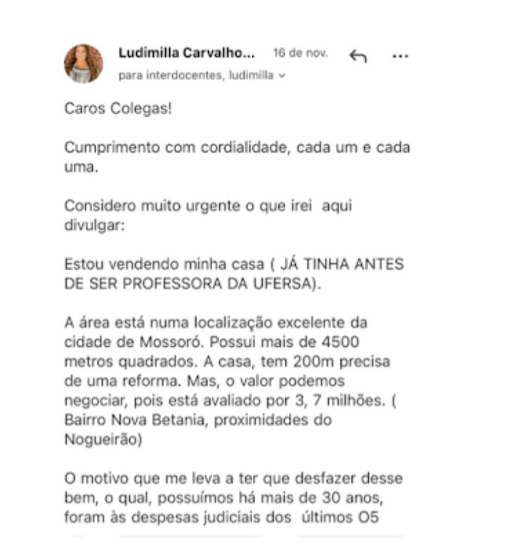 A ex-reitora da Ufersa, Ludimilla Carvalho, anunciou através das redes sociais à venda de um imóvel de sua propriedade avaliada em R$ 3,7 milhões para quitar dívidas judiciais.