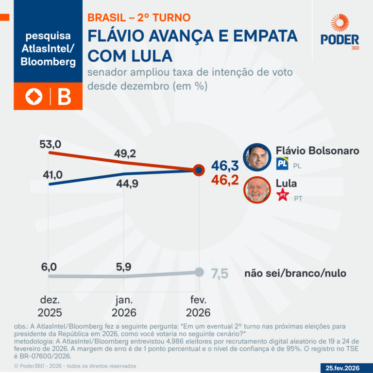 Na simulação do 2º turno, Flávio derrotaria Lula por 0,6%. Existem 5% dos eleitores que não sabem em quem votar e que poderão optar por Flávio se Lula continuar caindo. Ele tinha 46,7% em outubro, quando venceria Flávio por 9 pontos de diferença. Agora o adversário está na frente por pouco.