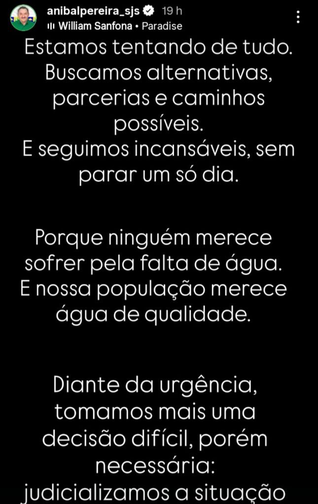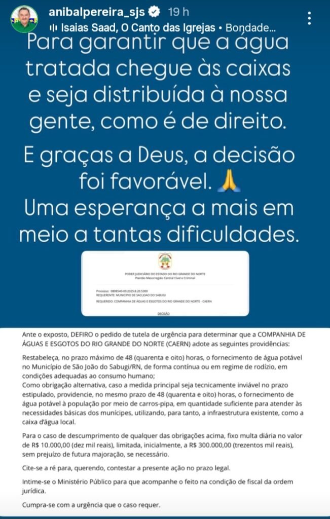 O prefeito Aníbal Pereira (MDB) comemorou a decisão judicial e afirmou que a Prefeitura tem atuado de forma firme para garantir o abastecimento de água no município. Segundo ele, a determinação da Justiça representa uma vitória para a população sabugiense diante da crise hídrica enfrentada pela cidade.