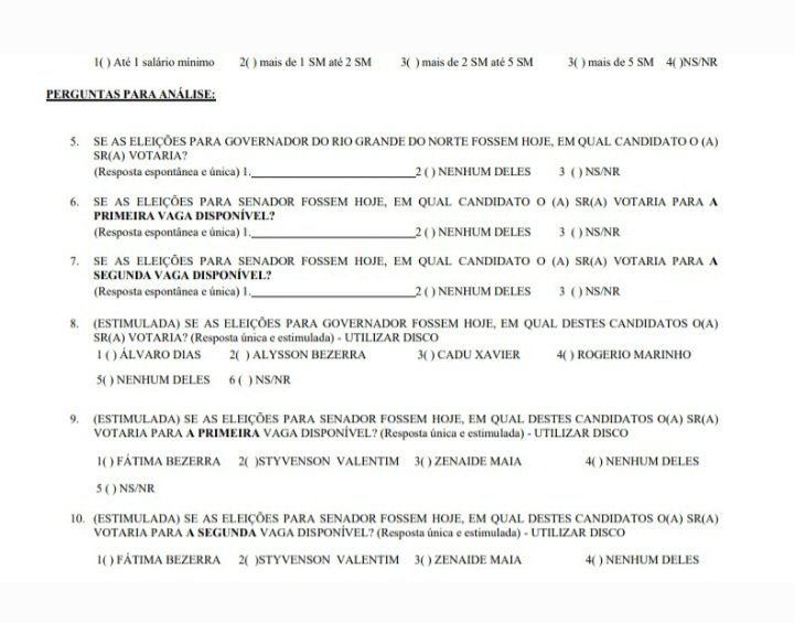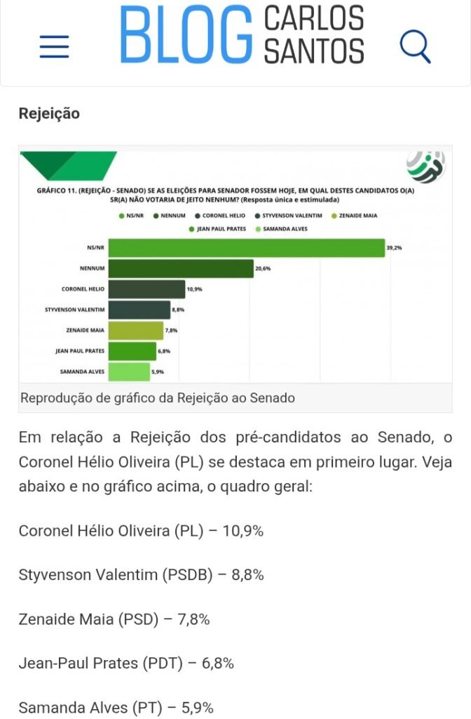 Entre os nomes citados nas divulgações, mas ausentes no registro oficial, estariam Coronel Hélio, Jean Paul Prates e Samanda Alves. As inconsistências também se estenderiam à pergunta sobre rejeição ao Senado. Enquanto o questionário registrado apresentaria apenas três opções — Styvenson Valentim, Fátima Bezerra e Zenaide Maia —, os dados divulgados incluiriam outros pré-candidatos.