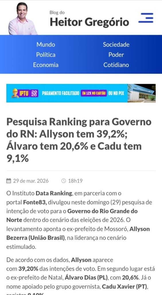 O levantamento, que indicaria ampla vantagem de Allyson Bezerra na disputa pelo Governo do Rio Grande do Norte, é alvo de uma ação no Tribunal Regional Eleitoral do estado (TRE-RN). A contestação aponta divergências entre o questionário oficialmente cadastrado e os resultados compartilhados por aliados políticos e veículos de comunicação.