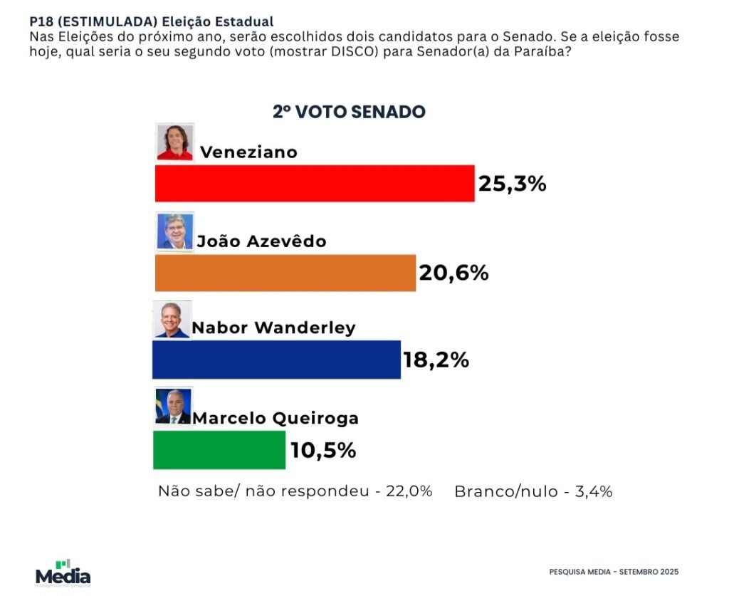 Quando o eleitor é questionado em qual seria seu segundo voto para o Senado, quem lidera é o atual senador Veneziano Vital do Rêgo(MDB), com 25,3%. Ele é seguido por João Azevêdo(PSB), com 20,6%. Logo em seguida aparece Nabor Wanderley, com 18,2% e o ex-ministro Marcelo Queiroga, com 10,5%.