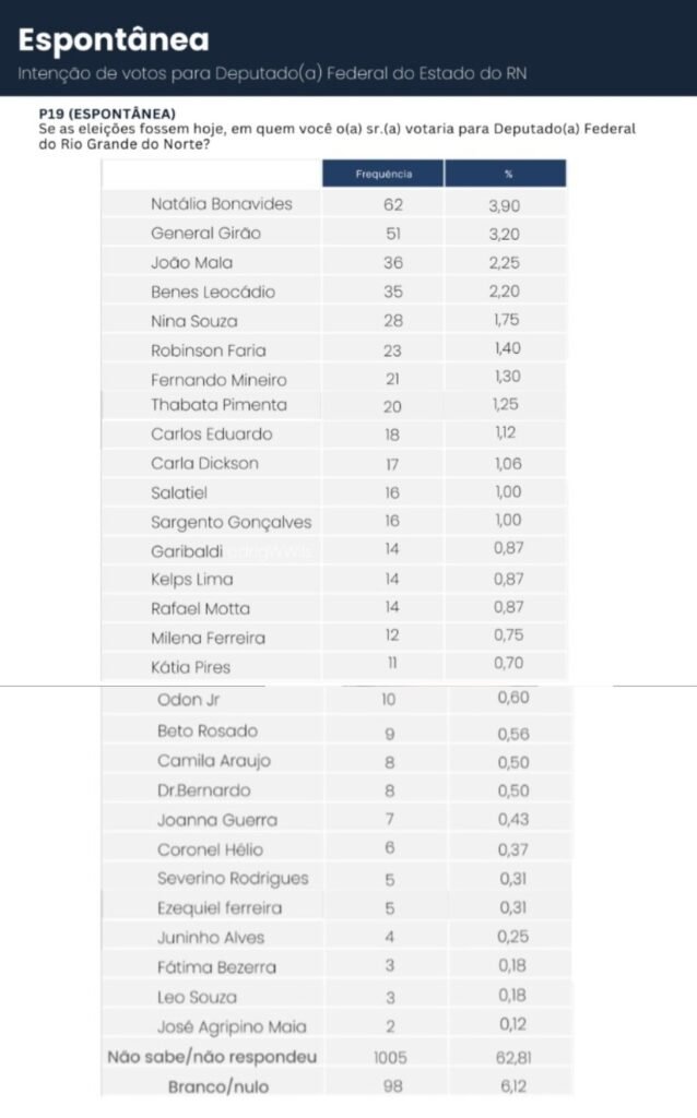 A deputada Natália Bonavides (PT), lidera com 3,90%, seguido pelo deputado General Girão(PL), com 3,20%, deputado João Maia(PP), com 2,25%, Benes Leocádio, com 2,20% e a secretária e primeira-dama de Natal, Nina Souza, com 1,75%.