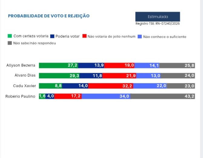 A primeira fotografia mais ampla da corrida pelo Governo do Rio Grande do Norte em 2026 mostra um cenário de pré-campanha já configurado, mas ainda longe de definição. Na pesquisa estimulada, em que os nomes dos pré-candidatos são apresentados ao entrevistado, Álvaro Dias (PL) aparece na liderança com 30,8% das intenções de voto, seguido por Allyson Bezerra (UP), com 27,2%. Em seguida vêm Cadu Xavier (PT), com 10,8%, e Robério Paulino, com 2,1%. Brancos e nulos somam 6,3%, enquanto 22,8% disseram não saber ou preferiram não responder.