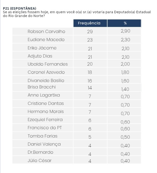 O vereador Robson Carvalho aparece na liderança da intenção de voto para deputado estadual entre os eleitores de Natal, de acordo com pesquisa exclusiva encomendada pelo jornal O Potengi ao instituto Media Inteligência em Pesquisa. O levantamento foi realizado nos dias 4 e 5 de dezembro de 2025, com 1.000 entrevistas presenciais em todas as regiões da capital potiguar. A margem de erro é de 3 pontos percentuais, com intervalo de confiança de 95%.