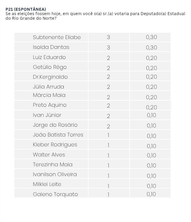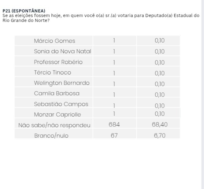 Na pergunta espontânea — quando os nomes dos candidatos não são apresentados — Robson Carvalho foi o mais citado, com 2,9% das intenções de voto, seguido por Eudiane Macedo (2,3%), Eriko Jácome e Adjuto Dias (ambos com 2,1%) e Ubaldo Fernandes (2%).