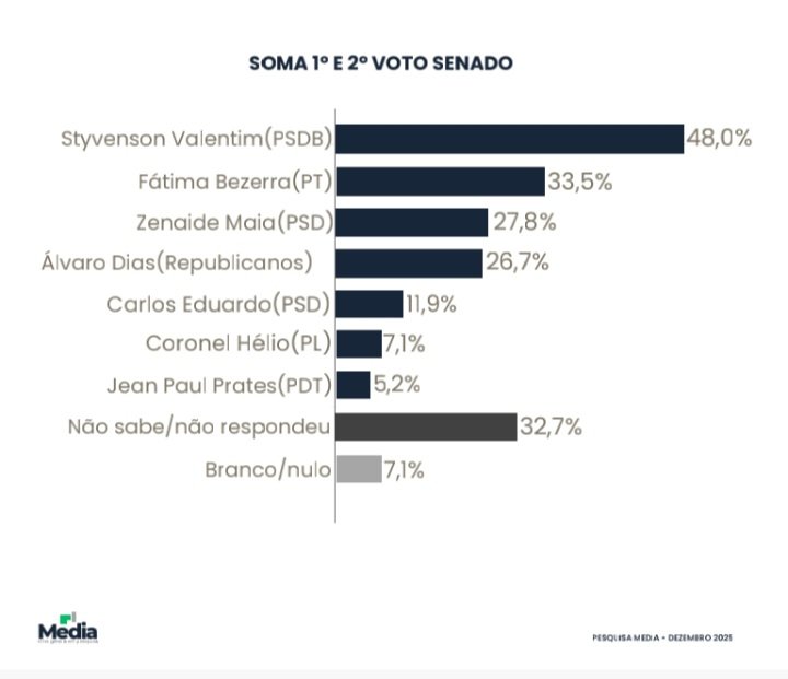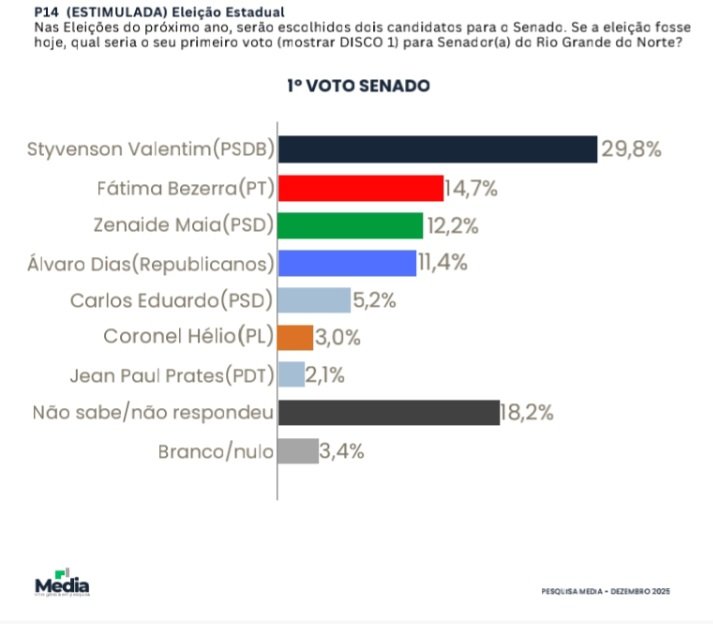 Pesquisa realizada pelo Instituto Media divulgada nesta segunda-feira(22) pelo jornal O Potengi revela um cenário competitivo na corrida pelas duas vagas ao Senado Federal no Rio Grande do Norte com ampla liderança do senador Styvenson Valentim (PSDB).
