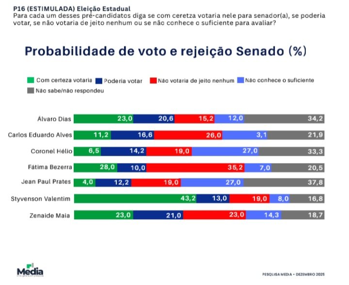 Na sequência, surgem Carlos Eduardo Alves (11,9%), Coronel Hélio(7,1%) e Jean Paul Prates (5,2%). Os eleitores que afirmaram não saber ou não responder somam 32,7%, enquanto 7,1% declararam intenção de votar em branco ou nulo para ambas as vagas.