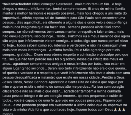 Horas antes do crime, o secretário manteve uma aparência de normalidade nas redes sociais, publicando vídeos dos filhos em atividades de rotina, como aula de luta e desenhos. No entanto, momentos antes dos disparos, Thales teria publicado uma carta de despedida (posteriormente apagada) onde relatava o fim do relacionamento e a descoberta de uma suposta traição.